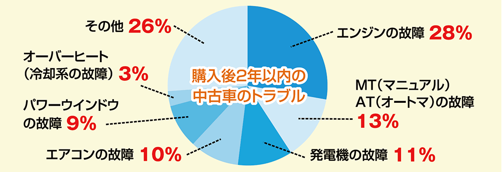「エアコンが効かない」「エンジンの音が変」「ボンネットから白煙が出た」「車が前に進まない」など…中古車の約3台に1台は、2年間で何かしら故障が発生していることをご存知ですか?