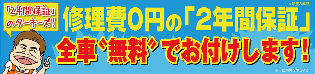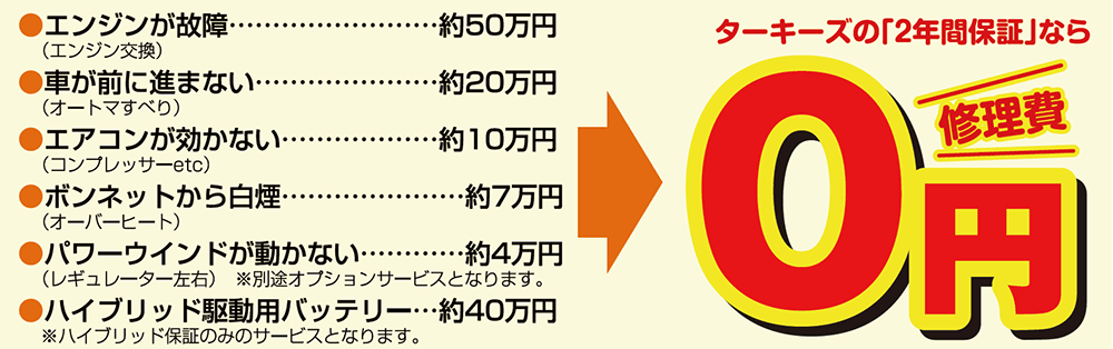 通常「2年間保証」は、有料で付くことが多いサービスですが、ターキーズではお客様が中古車をさらに安心して乗っていただくために全車に「2年間保証」を無料でお付けします!